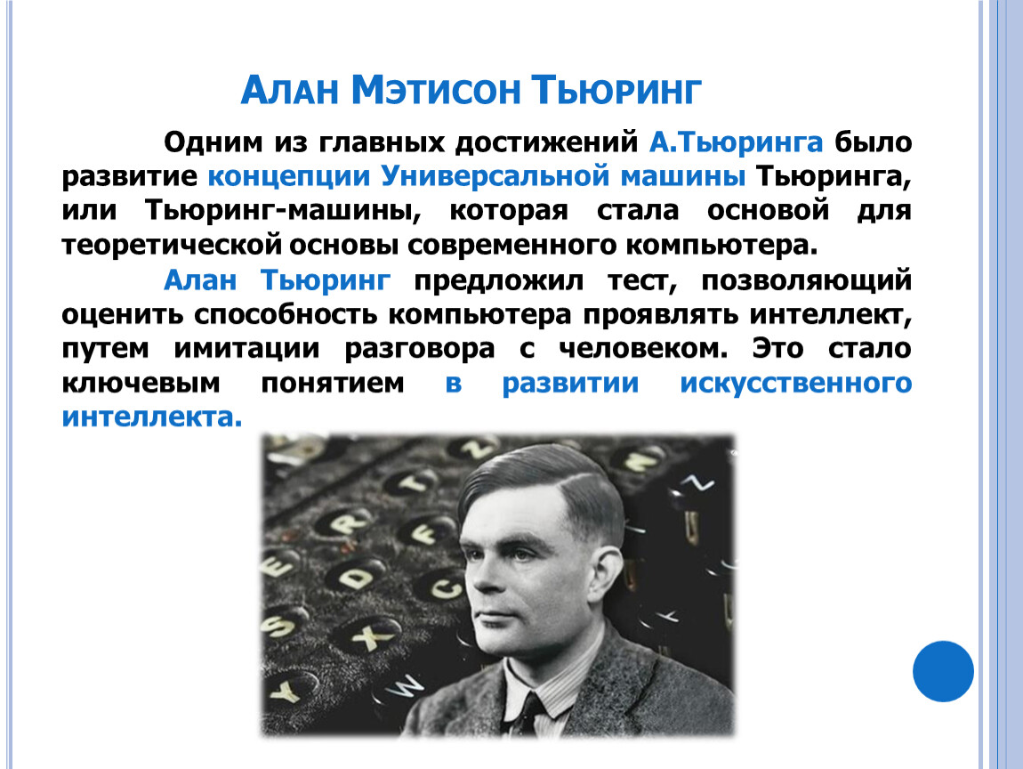 Одним из главных достижений А.Тьюринга было развитие концепции Универсальной машины Тьюринга, или Тьюринг-машины, которая стала основой для теоретической основы современного компьютера.