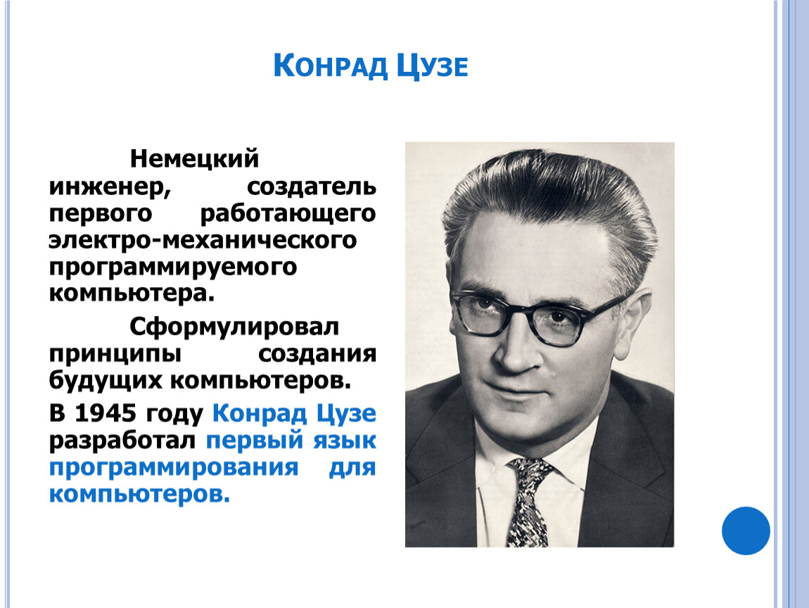 Немецкий инженер, создатель первого работающего электро-механического программируемого компьютера.