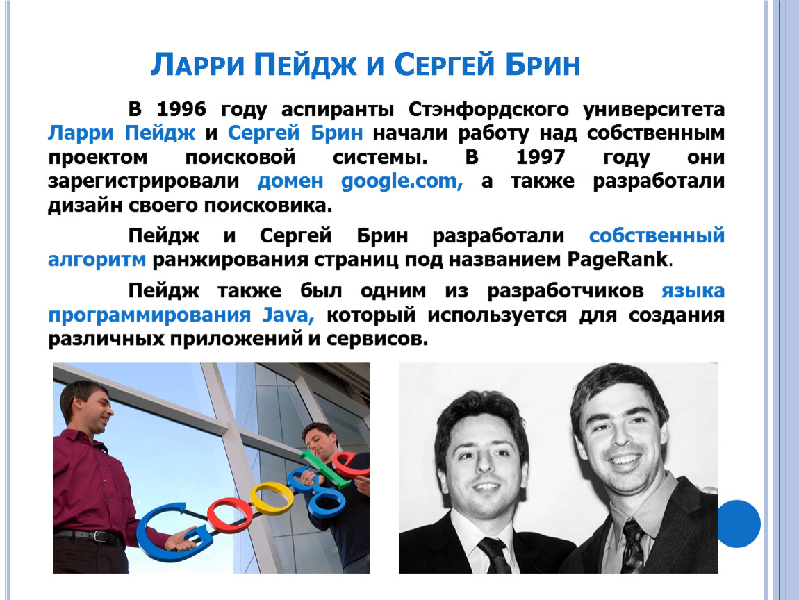 В 1996 году аспиранты Стэнфордского университета Ларри Пейдж и Сергей Брин начали работу над собственным проектом поисковой системы. В 1997 году они зарегистрировали домен google.com, а также разработали дизайн своего поисковика.