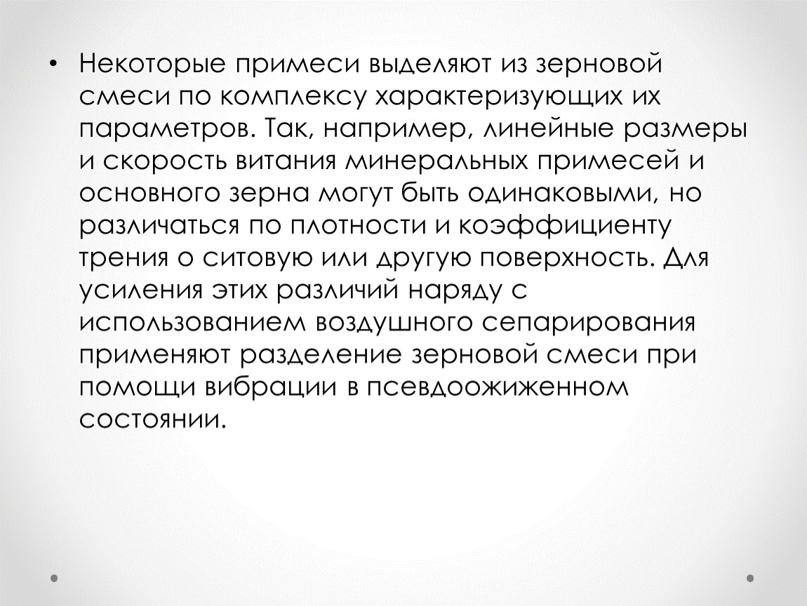 Некоторые примеси выделяют из зерновой смеси по комплексу характеризующих их параметров. Так, например, линейные размеры и скорость витания минеральных примесей и основного зерна могут быть одинаковыми, но различаться по плотности и коэффициенту трения о ситовую или другую поверхность. Для усиления этих различий наряду с использованием воздушного сепарирования применяют разделение зерновой смеси при помощи вибрации в псевдоожиженном состоянии.