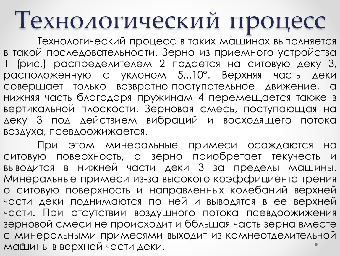 Технологический процесс в таких машинах выполняется в такой последовательности. Зерно из приемного устройства 1 (рис.) распределителем 2 подается на ситовую деку 3, расположенную с уклоном 5...10°. Верхняя часть деки совершает только возвратно-поступательное движение, а нижняя часть благодаря пружинам 4 перемещается также в вертикальной плоскости. Зерновая смесь, поступающая на деку 3 под действием вибраций и восходящего потока воздуха, псевдоожижается.