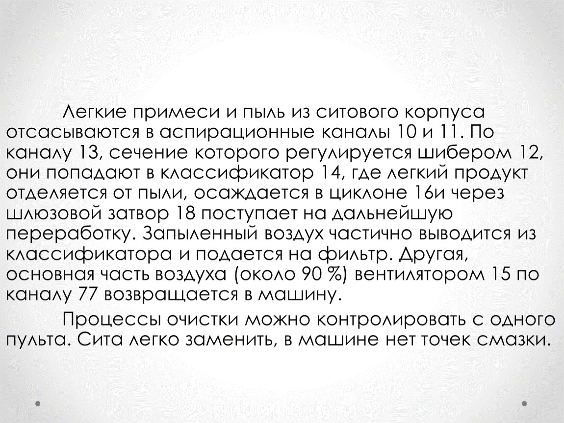Легкие примеси и пыль из ситового корпуса отсасываются в аспирационные каналы 10 и 11. По каналу 13, сечение которого регулируется шибером 12, они попадают в классификатор 14, где легкий продукт отделяется от пыли, осаждается в циклоне 16и через шлюзовой затвор 18 поступает на дальнейшую переработку. Запыленный воздух частично выводится из классификатора и подается на фильтр. Другая, основная часть воздуха (около 90 %) вентилятором 15 по каналу 77 возвращается в машину.