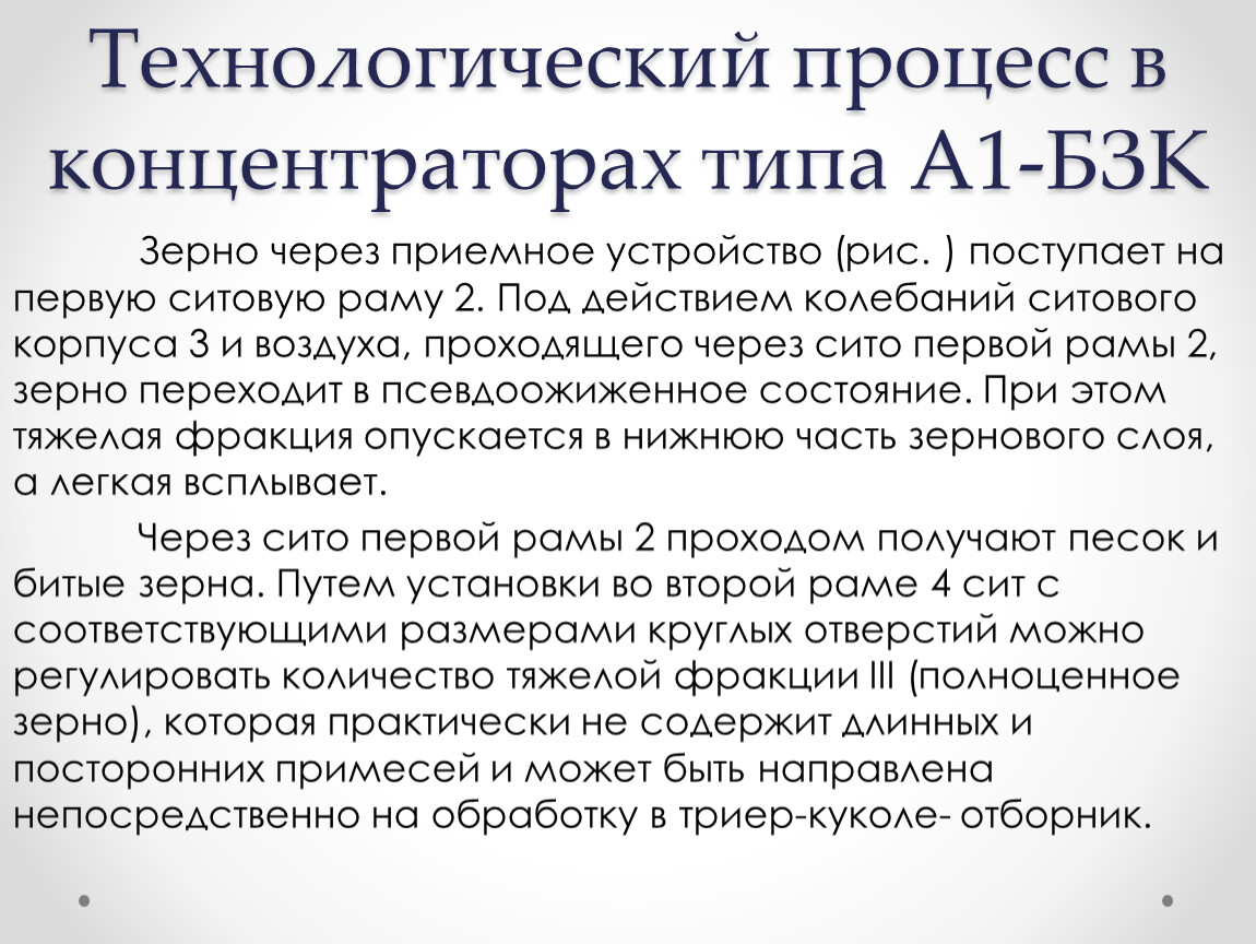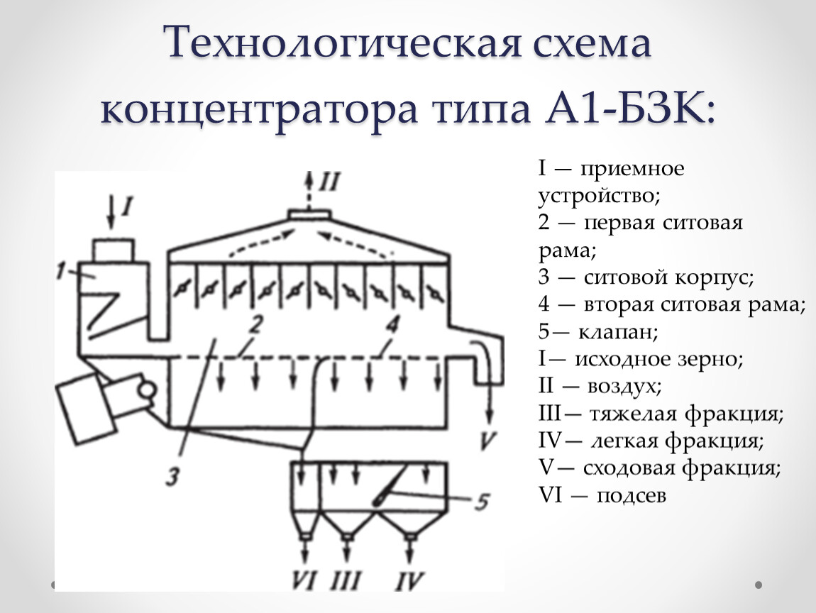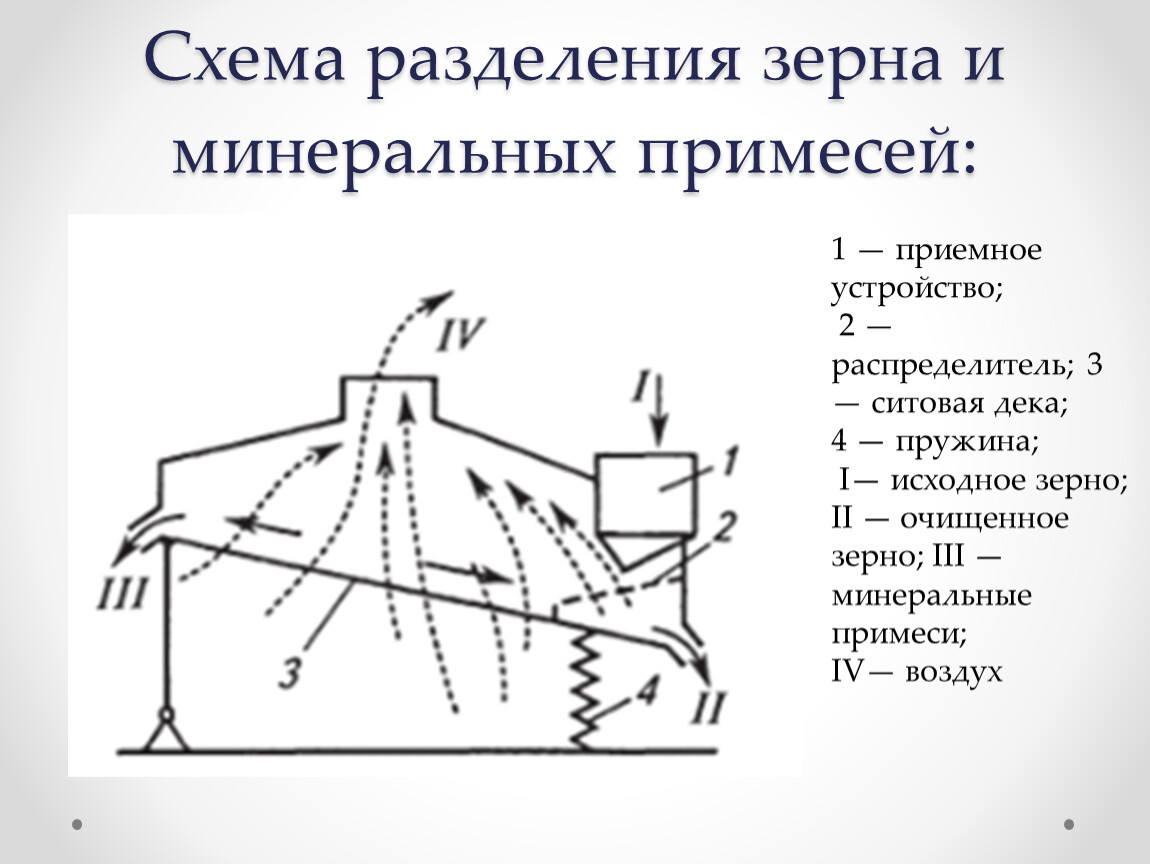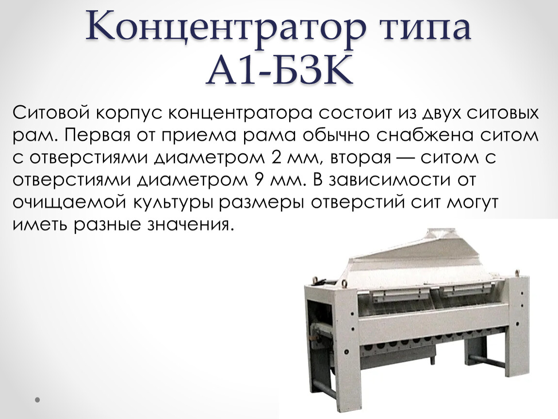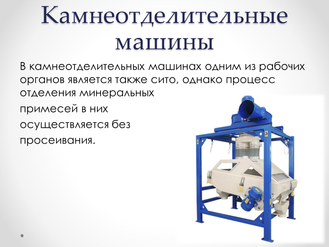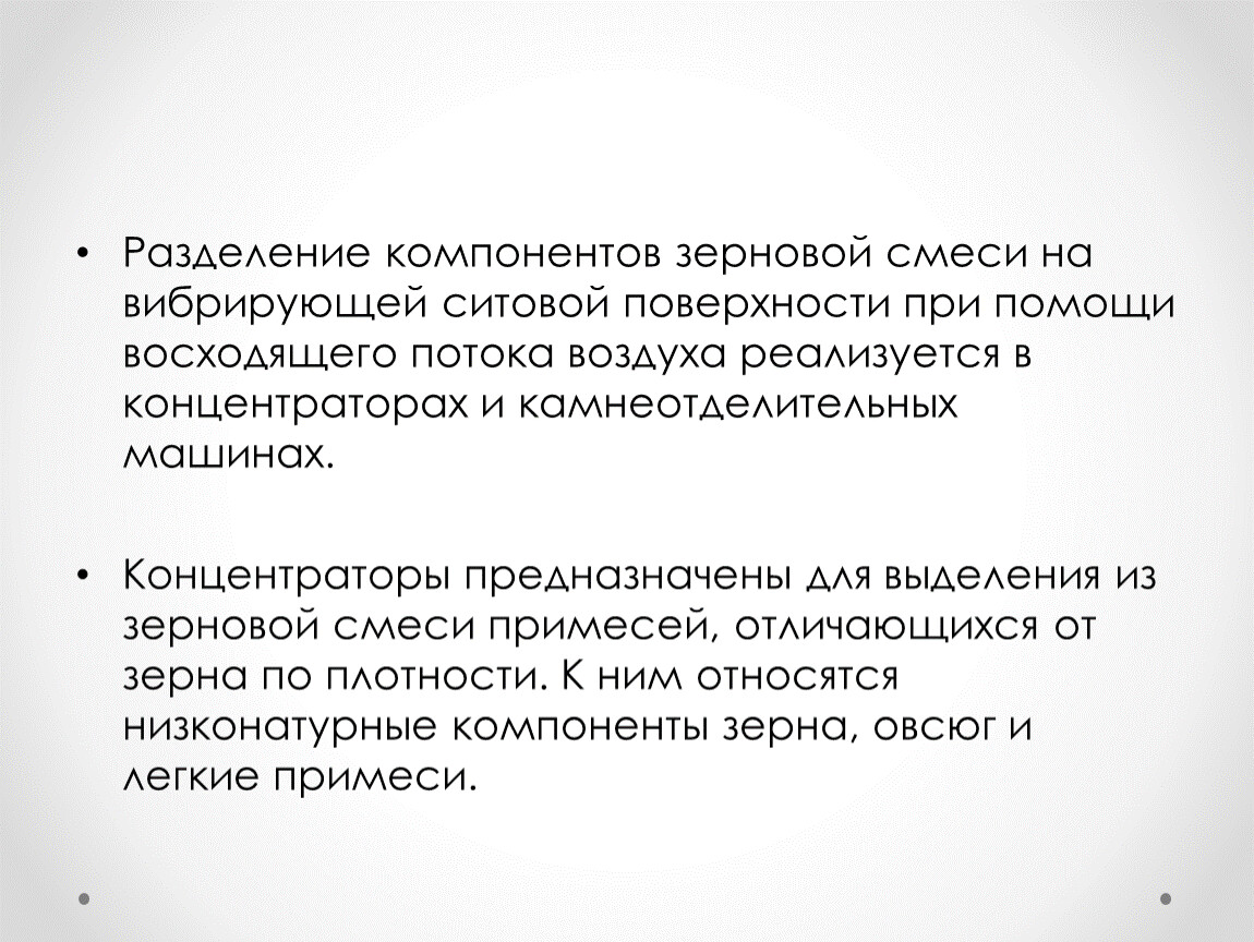Разделение компонентов зерновой смеси на вибрирующей ситовой поверхности при помощи восходящего потока воздуха реализуется в концентраторах и камнеотделительных машинах.