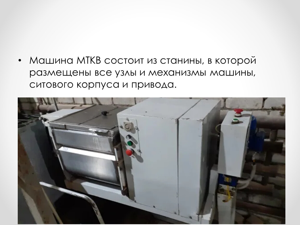 Машина МТКВ состоит из станины, в которой размещены все узлы и механизмы машины, ситового корпуса и привода.