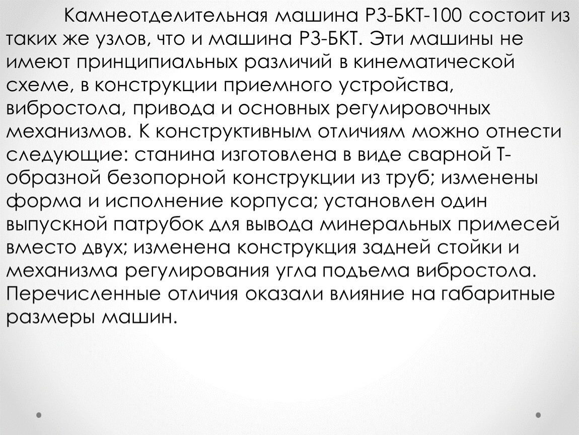 Камнеотделительная машина РЗ-БКТ-100 состоит из таких же узлов, что и машина РЗ-БКТ. Эти машины не имеют принципиальных различий в кинематической схеме, в конструкции приемного устройства, вибростола, привода и основных регулировочных механизмов. К конструктивным отличиям можно отнести следующие: станина изготовлена в виде сварной Т-образной безопорной конструкции из труб; изменены форма и исполнение корпуса; установлен один выпускной патрубок для вывода минеральных примесей вместо двух; изменена конструкция задней стойки и механизма регулирования угла подъема вибростола. Перечисленные отличия оказали влияние на габаритные размеры машин.