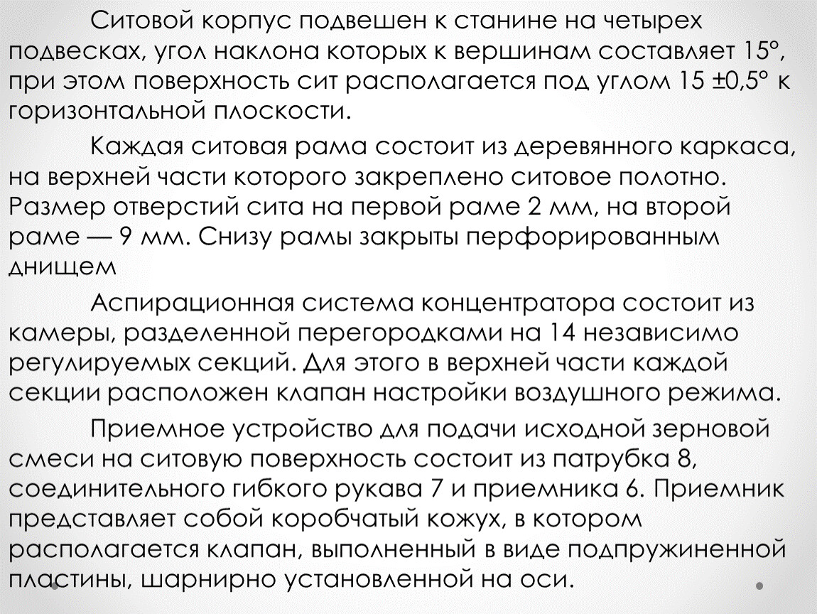 Ситовой корпус концентратора состоит из двух ситовых рам. Первая от приема рама обычно снабжена ситом с отверстиями диаметром 2 мм, вторая — ситом с отверстиями диаметром 9 мм. В зависимости от очищаемой культуры размеры отверстий сит могут иметь разные значения.