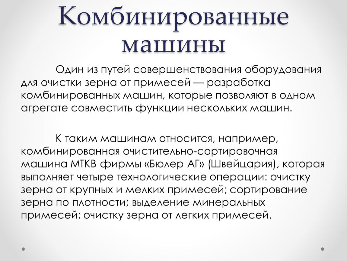 К таким машинам относится, например, комбинированная очистительно-сортировочная машина МТКВ фирмы «Бюлер АГ» (Швейцария), которая выполняет четыре технологические операции: очистку зерна от крупных и мелких примесей; сортирование зерна по плотности; выделение минеральных примесей; очистку зерна от легких примесей.
