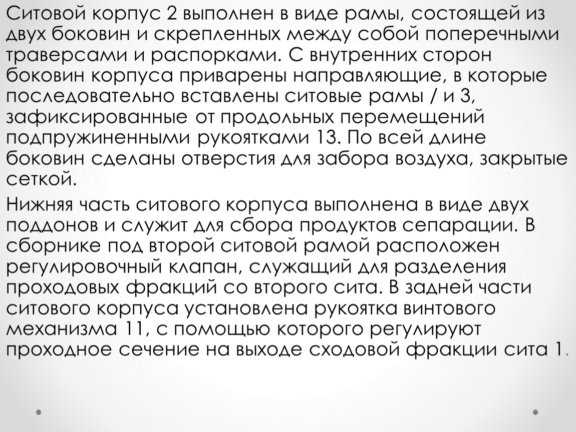 Нижняя часть ситового корпуса выполнена в виде двух поддонов и служит для сбора продуктов сепарации. В сборнике под второй ситовой рамой расположен регулировочный клапан, служащий для разделения проходовых фракций со второго сита. В задней части ситового корпуса установлена рукоятка винтового механизма 11, с помощью которого регулируют проходное сечение на выходе сходовой фракции сита 1.