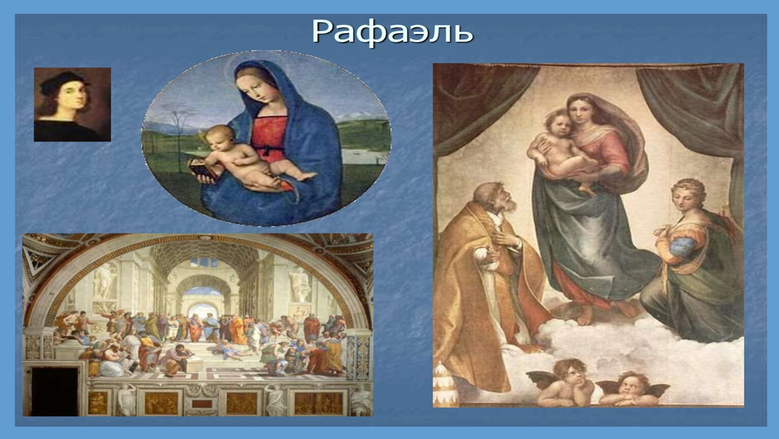 Во Флоренции жил живописец Рафаэль Санти (1483–1520), автор знаменитых картин «Сикстинская Мадонна» и «Афинская школа». Его слава привела к приглашению в Ватикан, где он стал официальным художником при дворе папы римского.