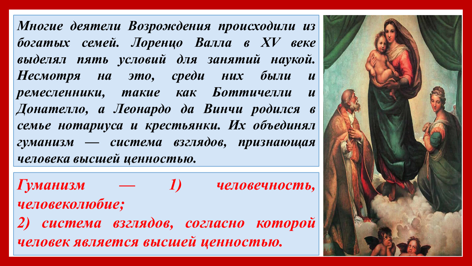 Многие деятели Возрождения происходили из богатых семей. Лоренцо Валла в XV веке выделял пять условий для занятий наукой. Несмотря на это, среди них были и ремесленники, такие как Боттичелли и Донателло, а Леонардо да Винчи родился в семье нотариуса и крестьянки. Их объединял гуманизм — система взглядов, признающая человека высшей ценностью.