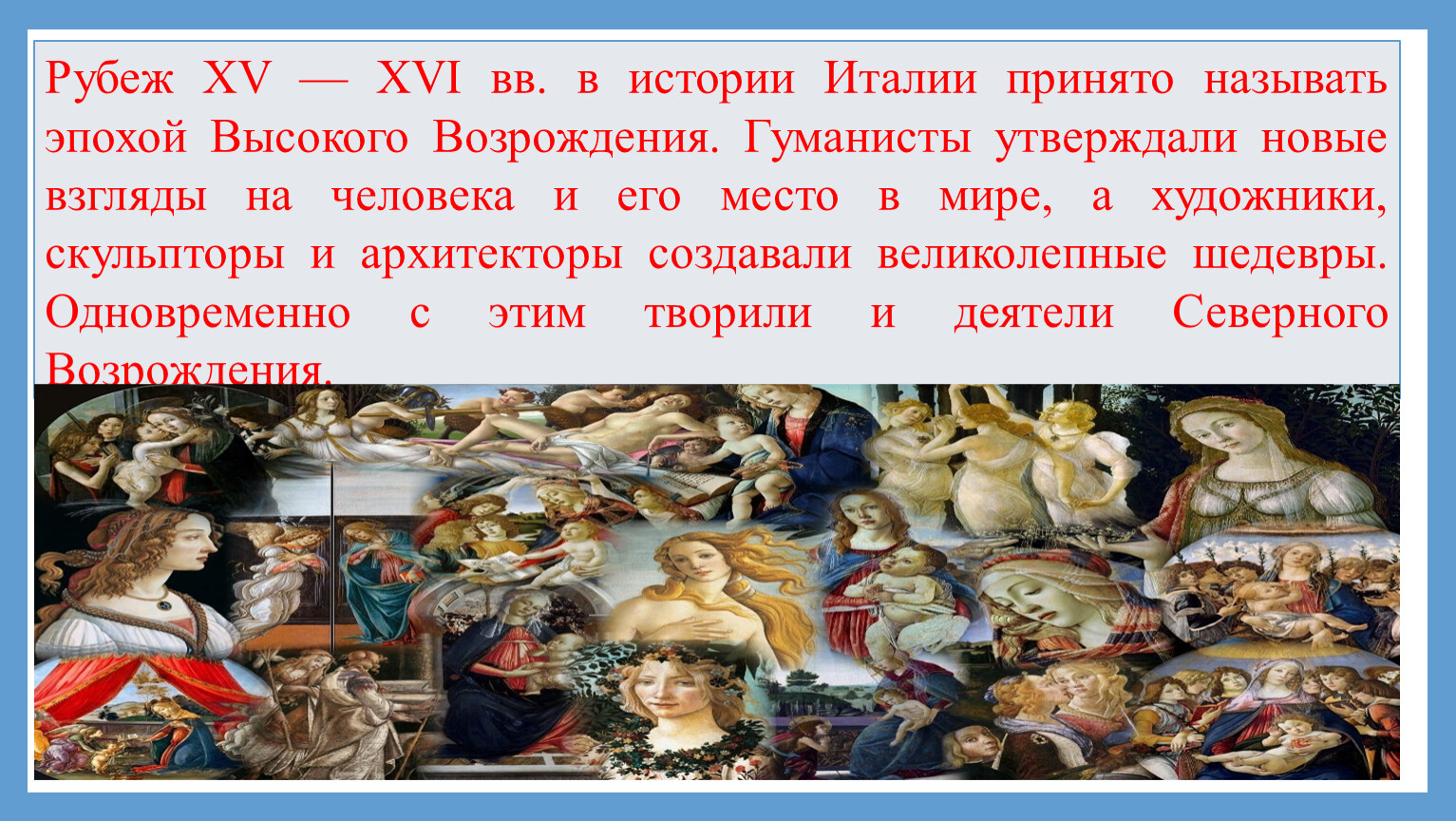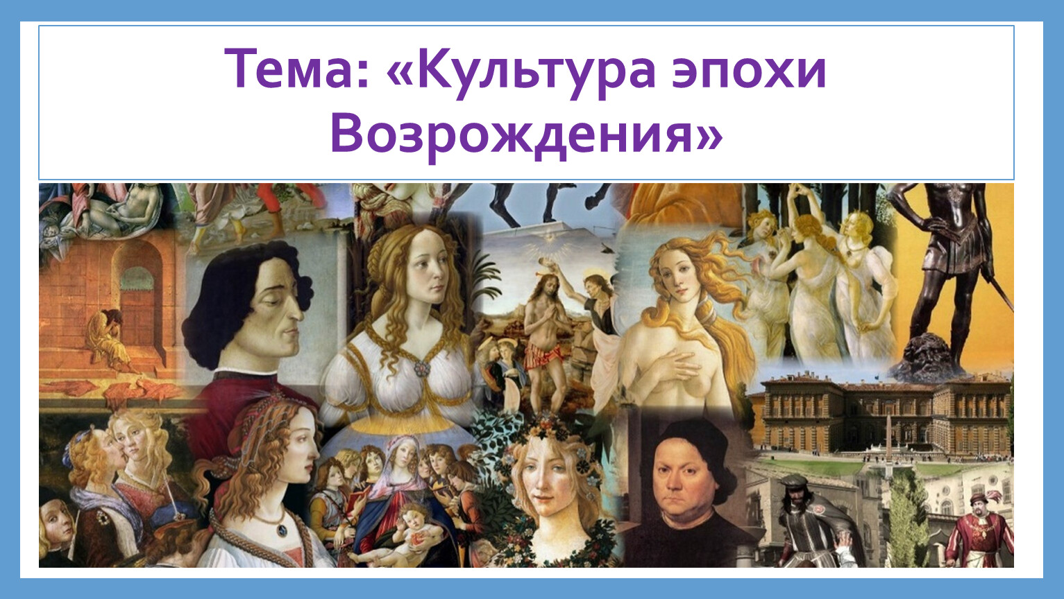 Отличительная черта эпохи Возрождения — светский характер культуры, её гуманизм и антропоцентризм, возросший интерес к античности. 15