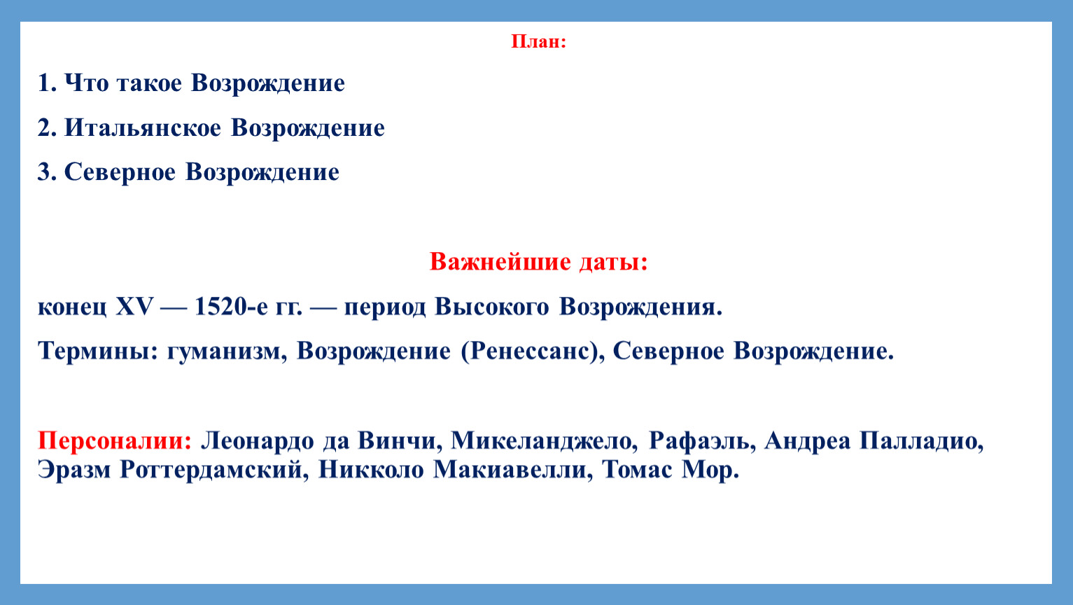 Персоналии: Леонардо да Винчи, Микеланджело, Рафаэль, Андреа Палладио, Эразм Роттердамский, Никколо Макиавелли, Томас Мор.