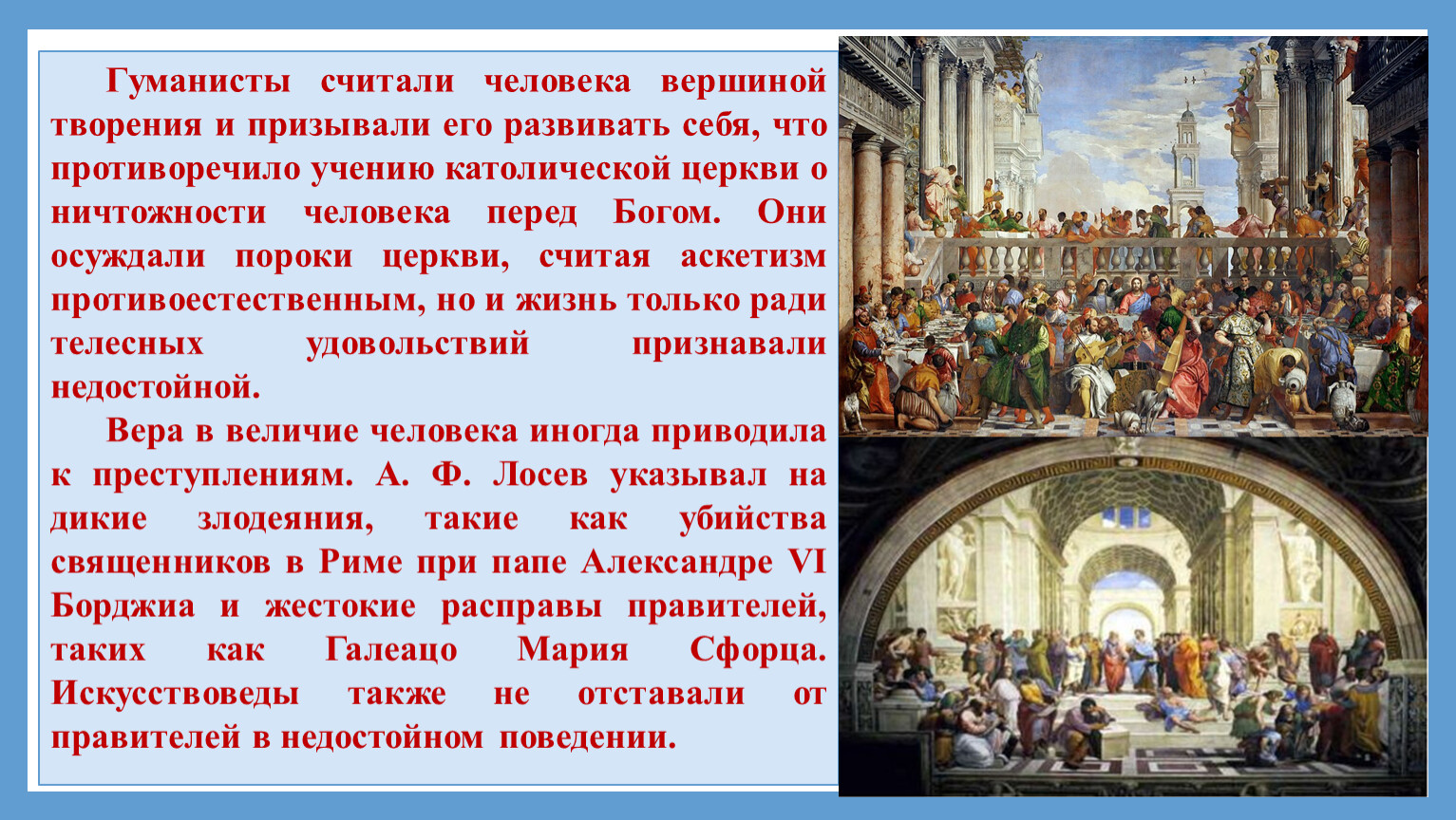 Вера в величие человека иногда приводила к преступлениям. А. Ф. Лосев указывал на дикие злодеяния, такие как убийства священников в Риме при папе Александре VI Борджиа и жестокие расправы правителей, таких как Галеацо Мария Сфорца. Искусствоведы также не отставали от правителей в недостойном поведении.