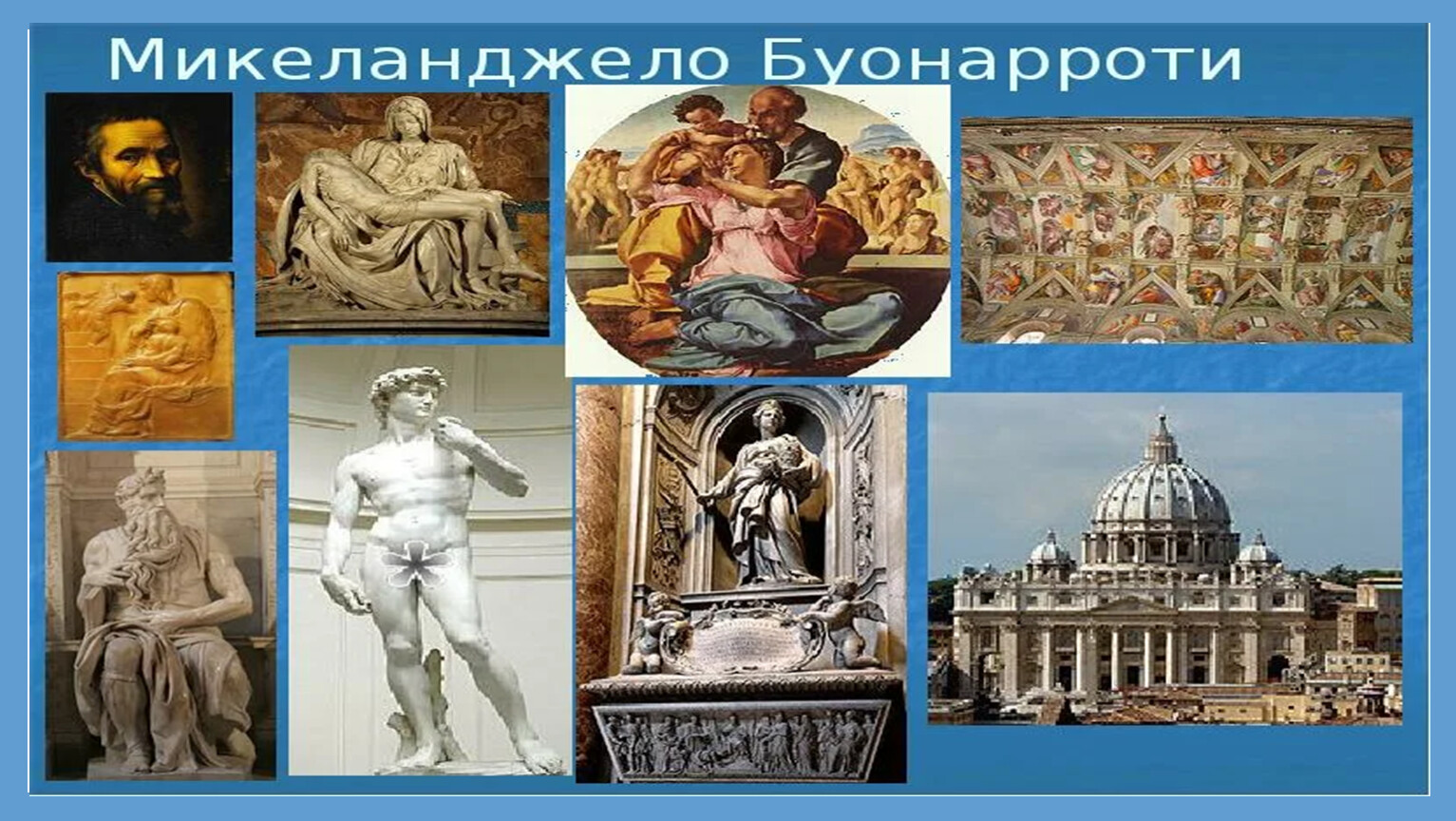 Возрождение зародилось в Италии, особенно во Флоренции, где династия Медичи поддерживала искусство. Микеланджело Буонарроти (1475–1564) создал известные скульптуры «Давид» и «Пьета», а также расписал Сикстинскую капеллу в Риме.