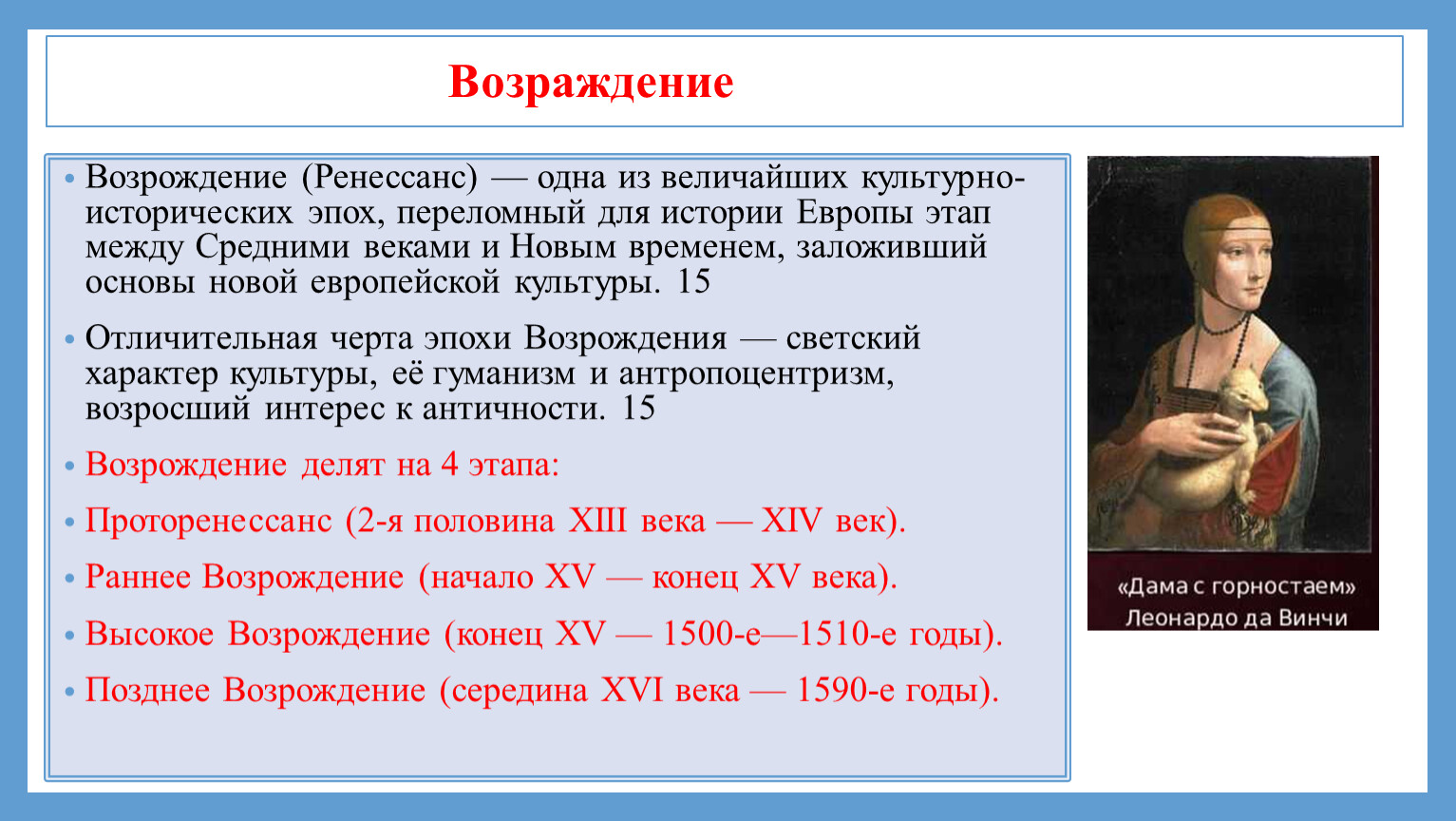 Возрождение (Ренессанс) — одна из величайших культурно-исторических эпох, переломный для истории Европы этап между Средними веками и Новым временем, заложивший основы новой европейской культуры. 15