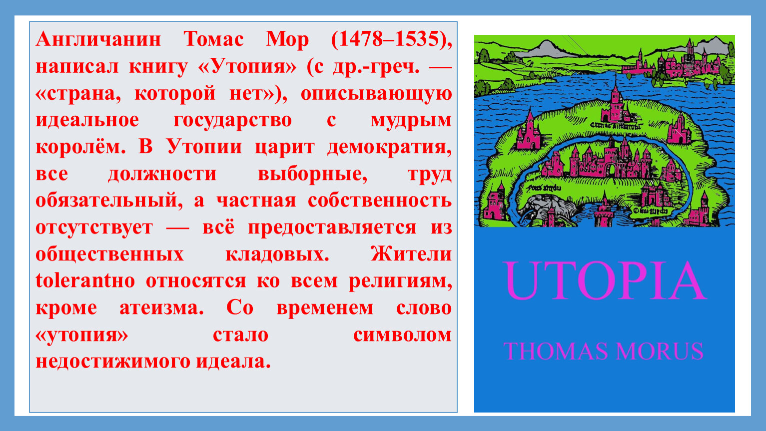Англичанин Томас Мор (1478–1535), написал книгу «Утопия» (с др.-греч. — «страна, которой нет»), описывающую идеальное государство с мудрым королём. В Утопии царит демократия, все должности выборные, труд обязательный, а частная собственность отсутствует — всё предоставляется из общественных кладовых. Жители tolerantно относятся ко всем религиям, кроме атеизма. Со временем слово «утопия» стало символом недостижимого идеала.