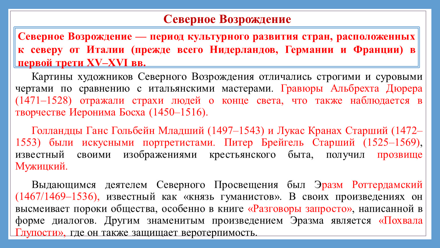 Термины: гуманизм, Возрождение (Ренессанс), Северное Возрождение.
