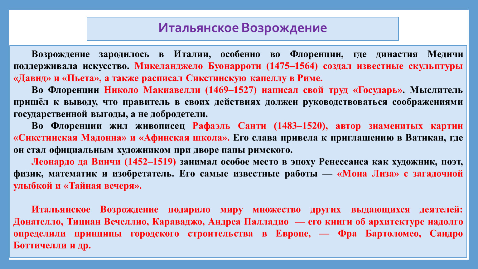 Итальянское Возрождение подарило миру множество других выдающихся деятелей: Донателло, Тициан Вечеллио, Караваджо, Андреа Палладио — его книги об архитектуре надолго определили принципы городского строительства в Европе, — Фра Бартоломео, Сандро Боттичелли и др.