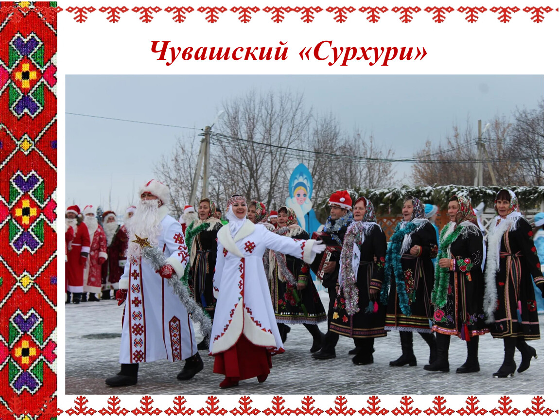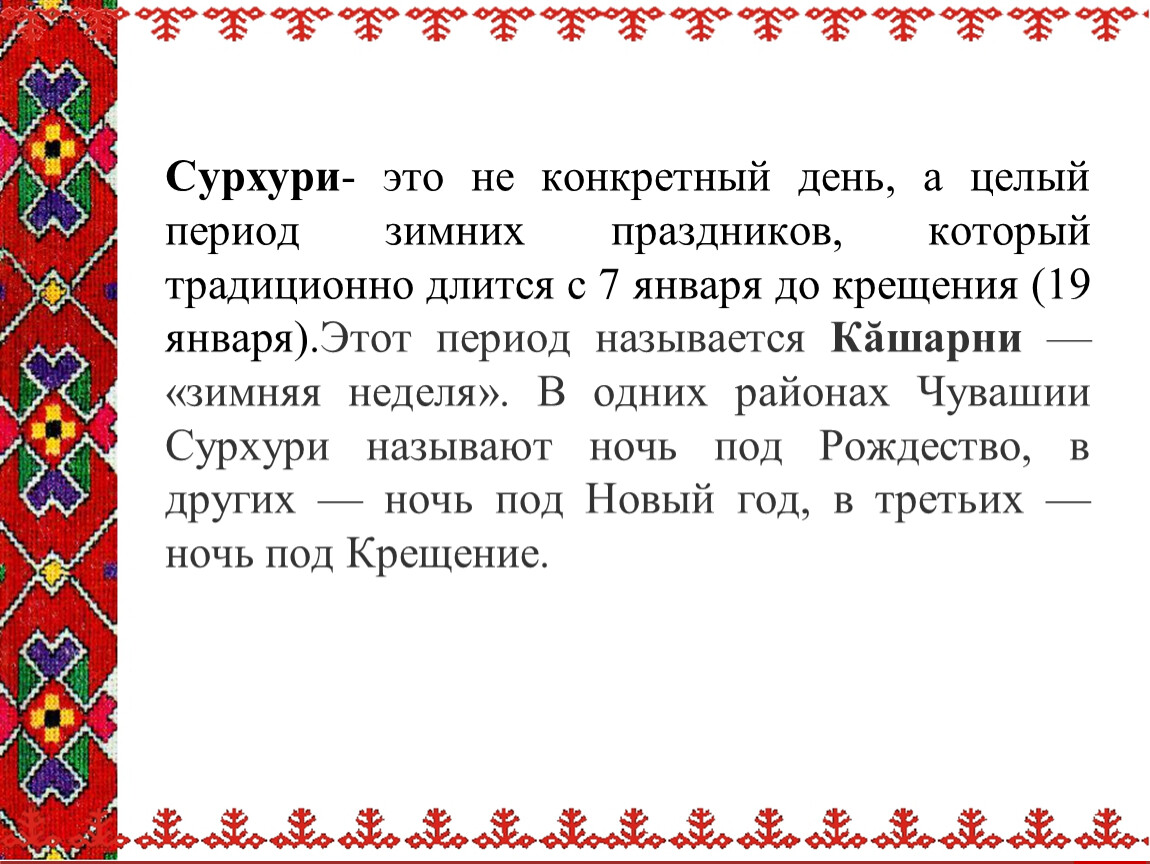 Сурхури- это не конкретный день, а целый период зимних праздников, который традиционно длится с 7 января до крещения (19 января).Этот период называется Кăшарни — «зимняя неделя». В одних районах Чувашии Сурхури называют ночь под Рождество, в других — ночь под Новый год, в третьих — ночь под Крещение.