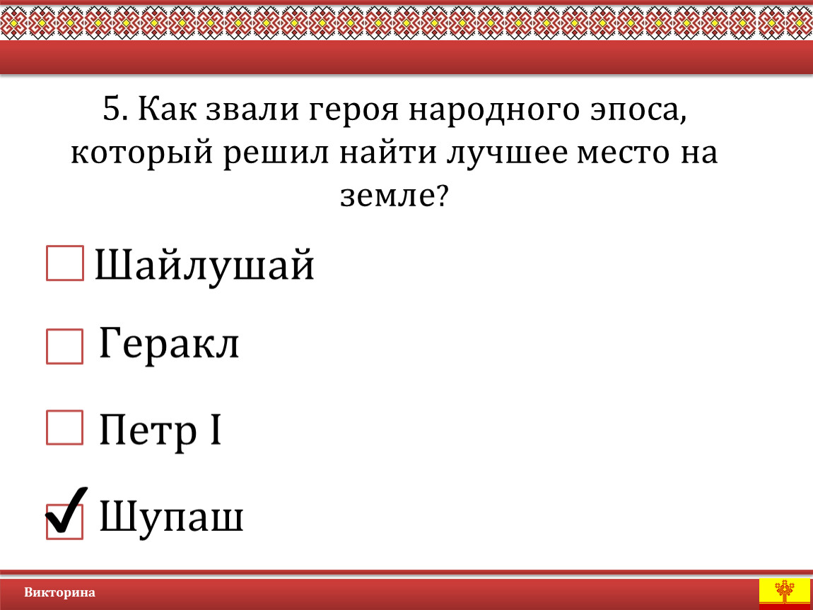 5. Как звали героя народного эпоса, который решил найти лучшее место на земле?