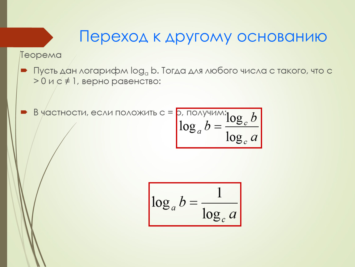 Пусть дан логарифм loga b. Тогда для любого числа c такого, что c > 0 и c ≠ 1, верно равенство: