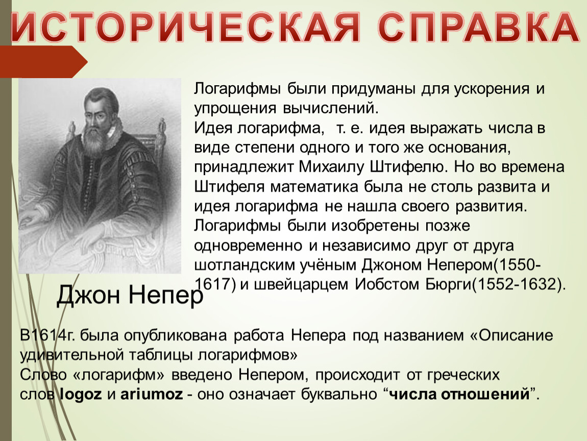 Идея логарифма, т. е. идея выражать числа в виде степени одного и того же основания, принадлежит Михаилу Штифелю. Но во времена Штифеля математика была не столь развита и идея логарифма не нашла своего развития.