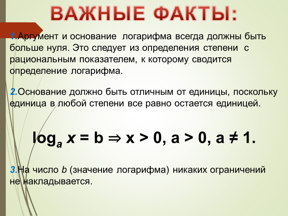 1.Аргумент и основание логарифма всегда должны быть больше нуля. Это следует из определения степени с рациональным показателем, к которому сводится
