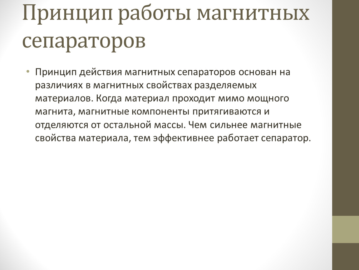 Принцип действия магнитных сепараторов основан на различиях в магнитных свойствах разделяемых материалов. Когда материал проходит мимо мощного магнита, магнитные компоненты притягиваются и отделяются от остальной массы. Чем сильнее магнитные свойства материала, тем эффективнее работает сепаратор.