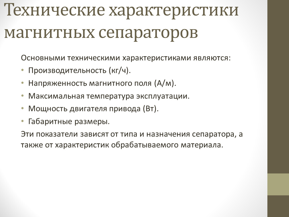 Эти показатели зависят от типа и назначения сепаратора, а также от характеристик обрабатываемого материала.