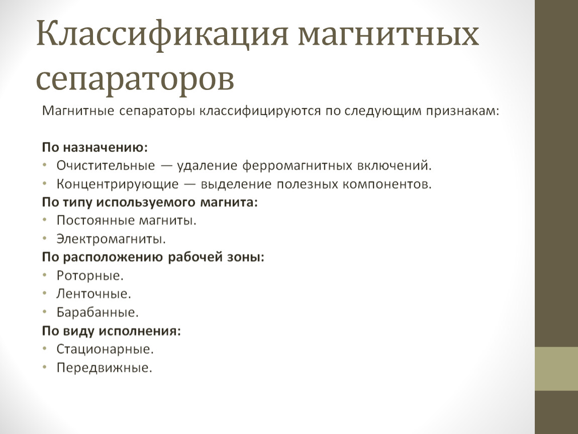 Типичный магнитный сепаратор состоит из следующих элементов:
