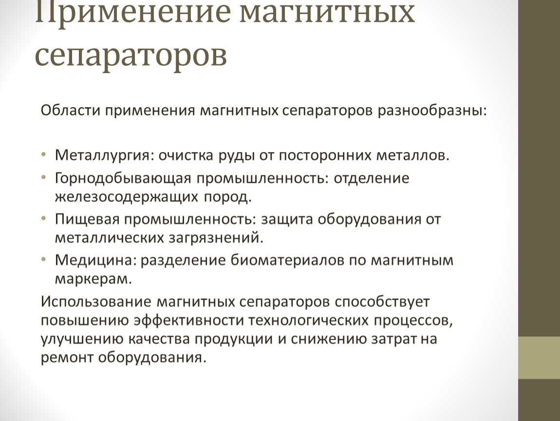Использование магнитных сепараторов способствует повышению эффективности технологических процессов, улучшению качества продукции и снижению затрат на ремонт оборудования.