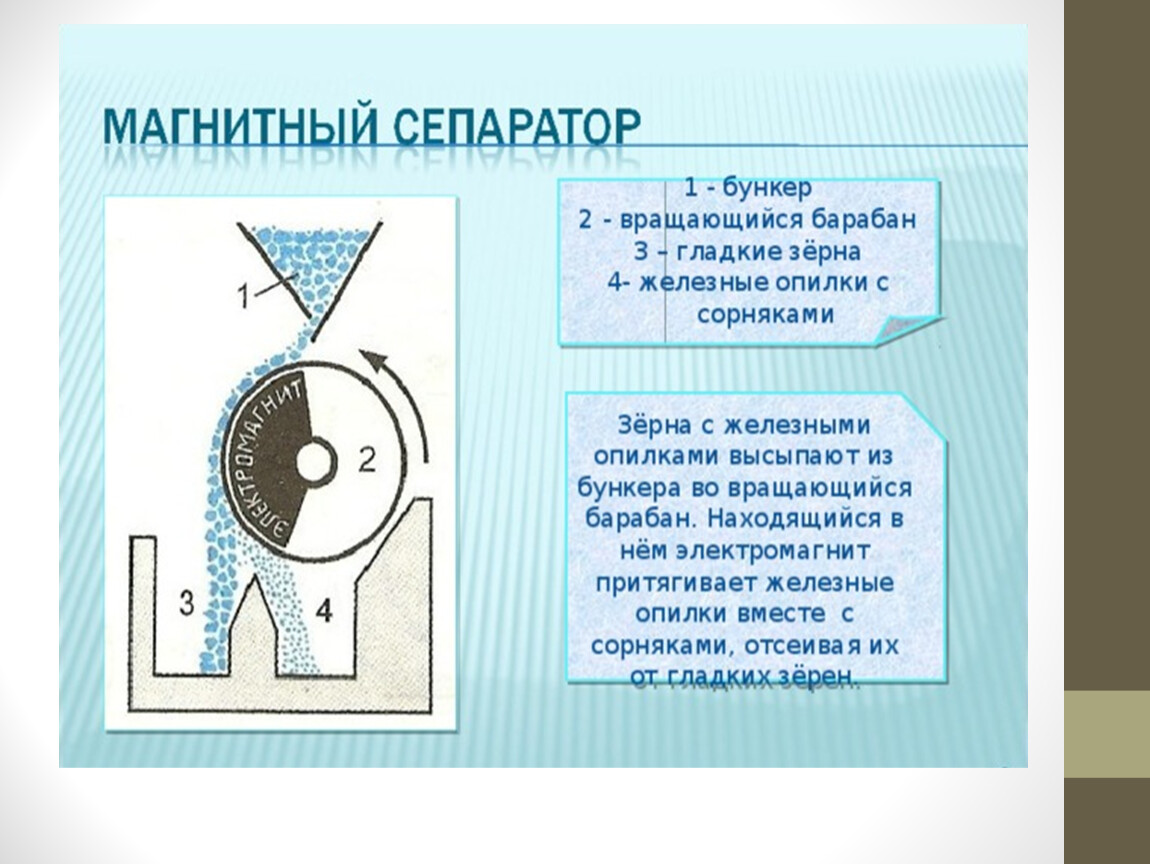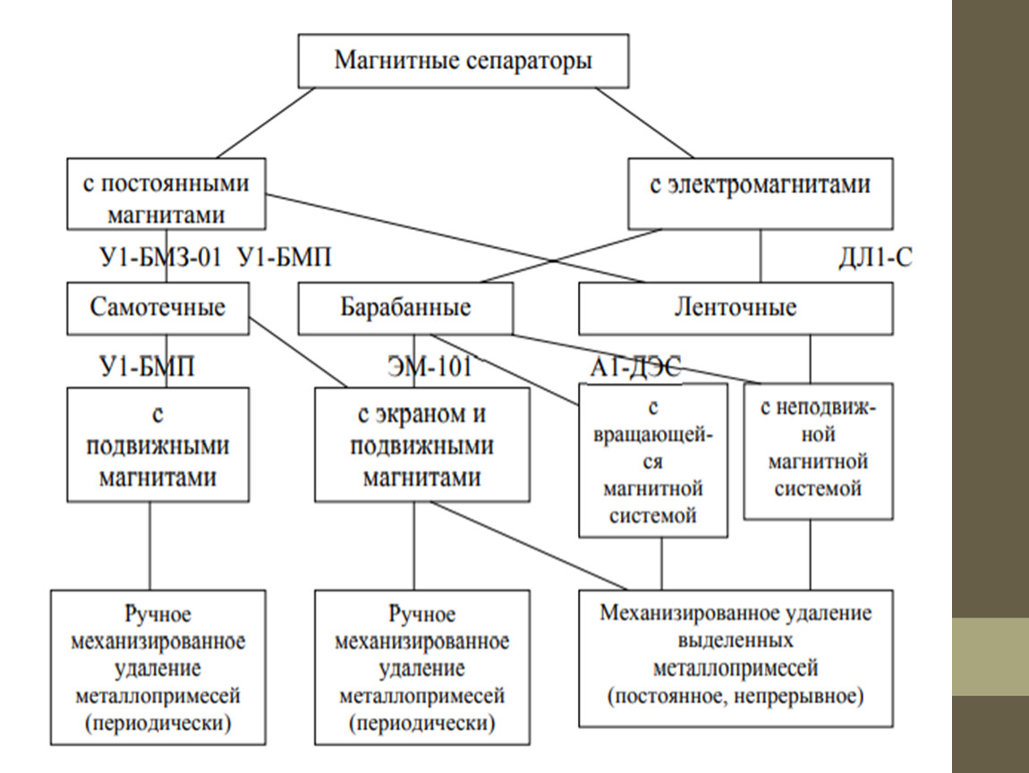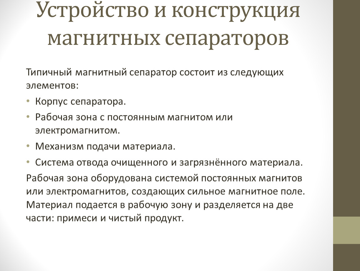 Рабочая зона оборудована системой постоянных магнитов или электромагнитов, создающих сильное магнитное поле. Материал подается в рабочую зону и разделяется на две части: примеси и чистый продукт.