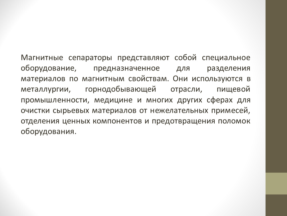 Магнитные сепараторы представляют собой специальное оборудование, предназначенное для разделения материалов по магнитным свойствам. Они используются в металлургии, горнодобывающей отрасли, пищевой промышленности, медицине и многих других сферах для очистки сырьевых материалов от нежелательных примесей, отделения ценных компонентов и предотвращения поломок оборудования.