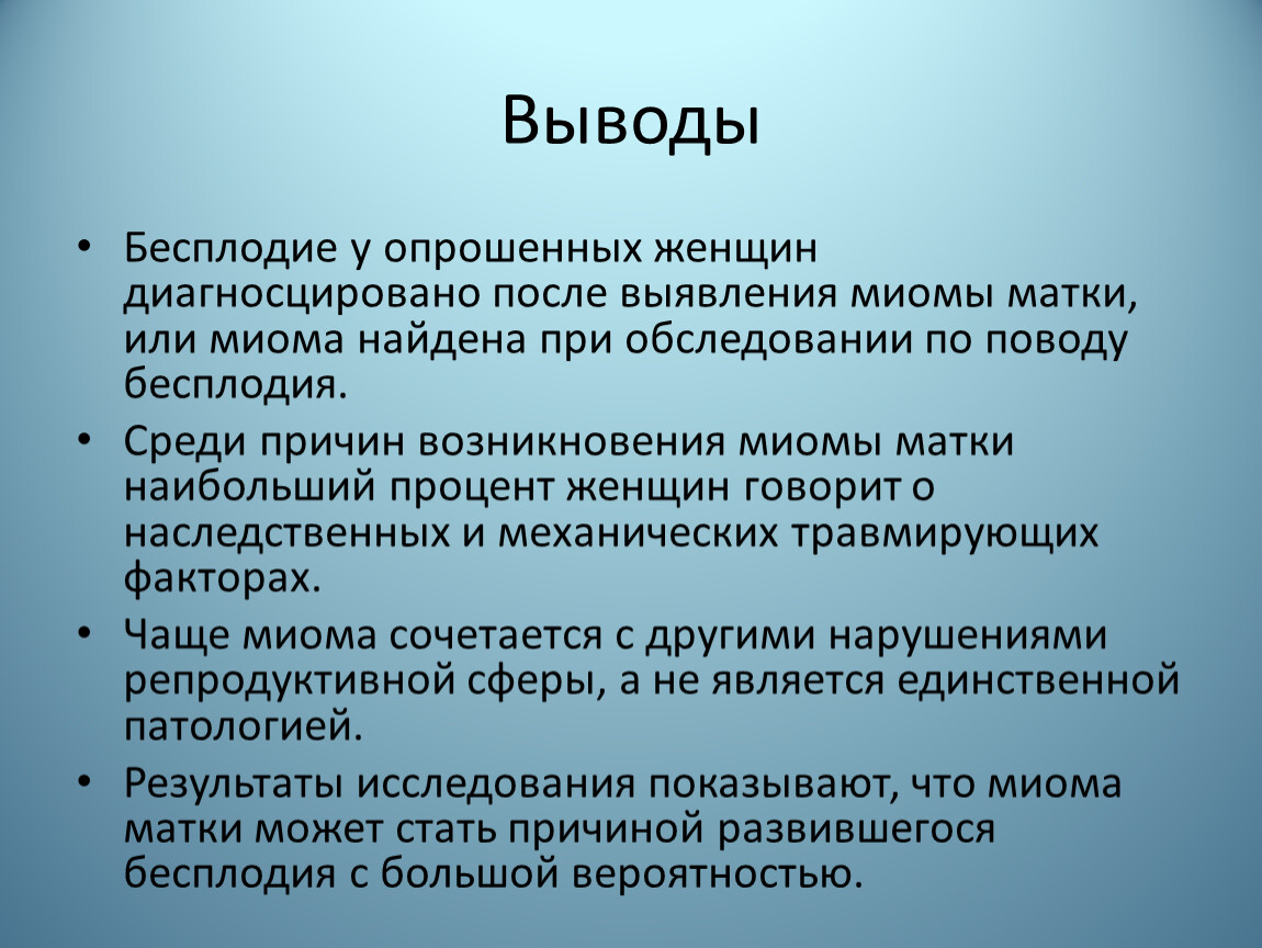 Результаты исследования показывают, что миома матки может стать причиной развившегося бесплодия с большой вероятностью.