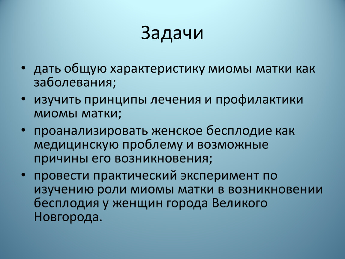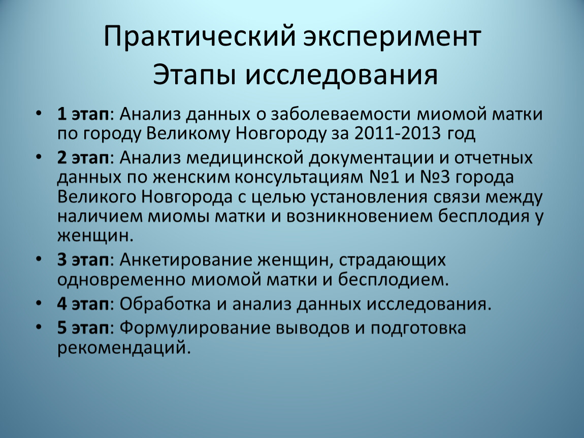провести практический эксперимент по изучению роли миомы матки в возникновении бесплодия у женщин города Великого Новгорода.