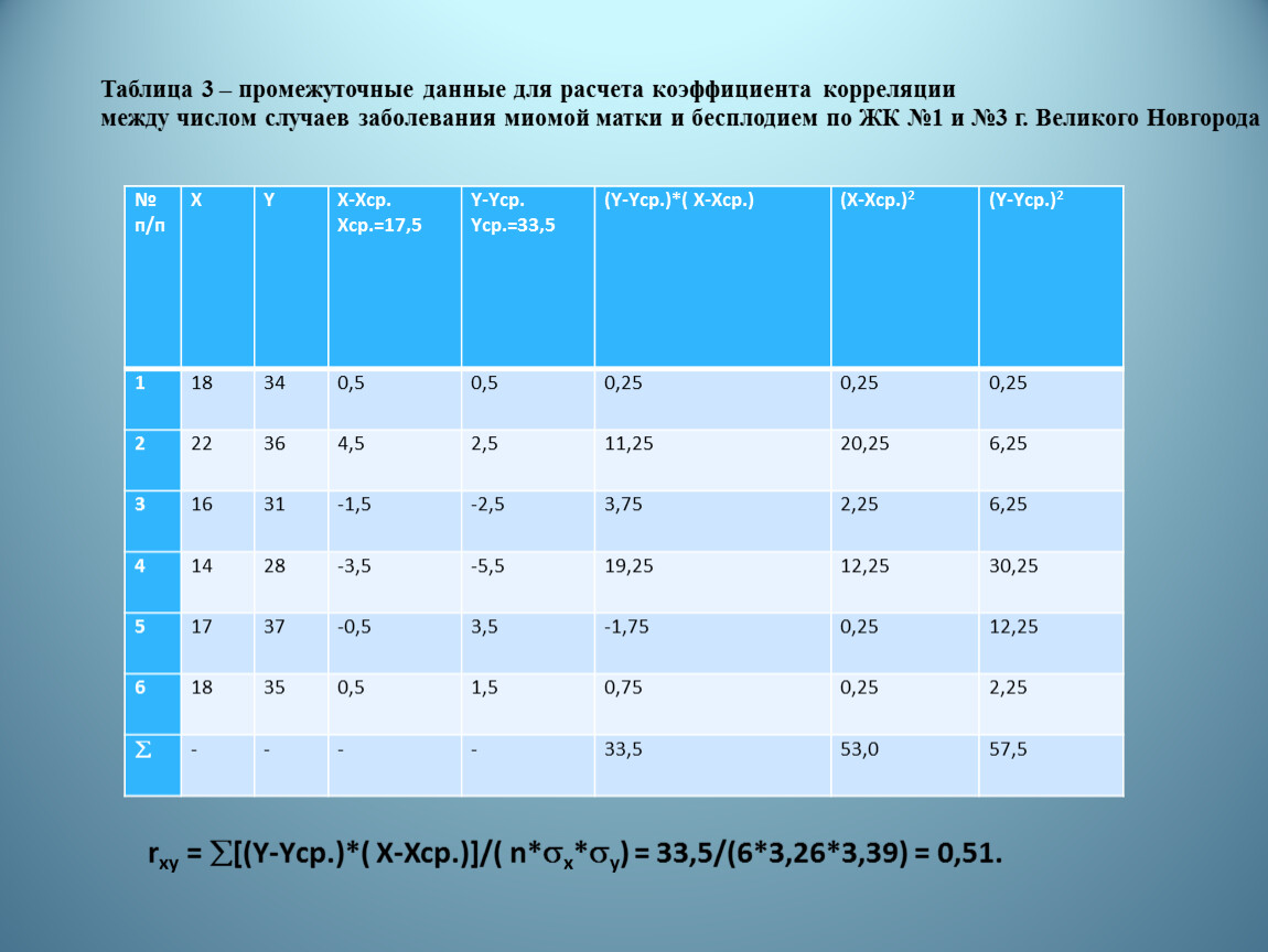 rхy = [(Y-Yср.)*( Х-Хср.)]/( n*х*y) = 33,5/(6*3,26*3,39) = 0,51.