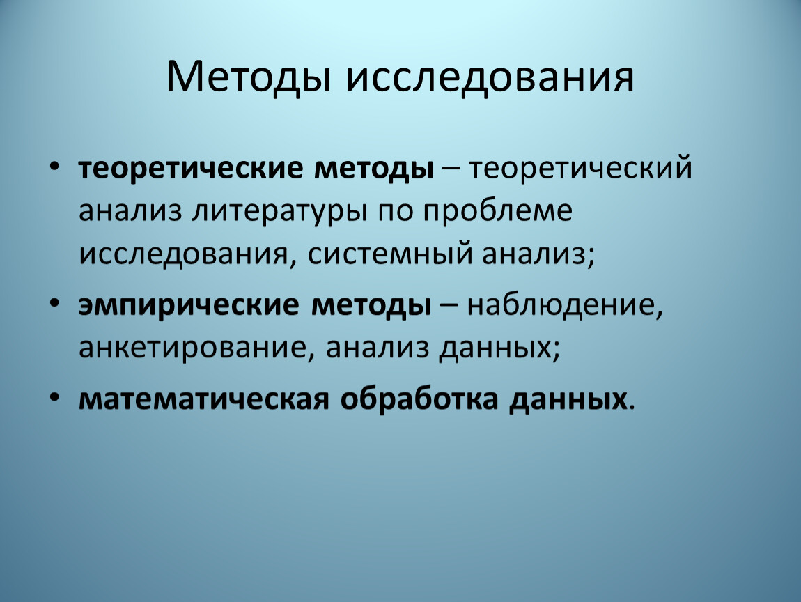 теоретические методы – теоретический анализ литературы по проблеме исследования, системный анализ;