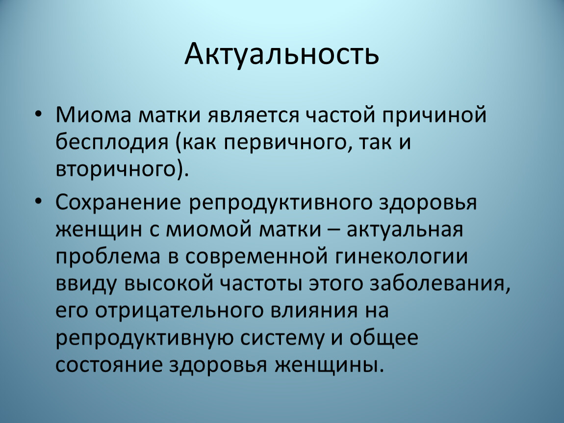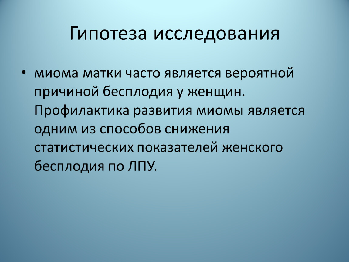 Цель работы – изучить роль миомы матки в возникновении женского бесплодия.