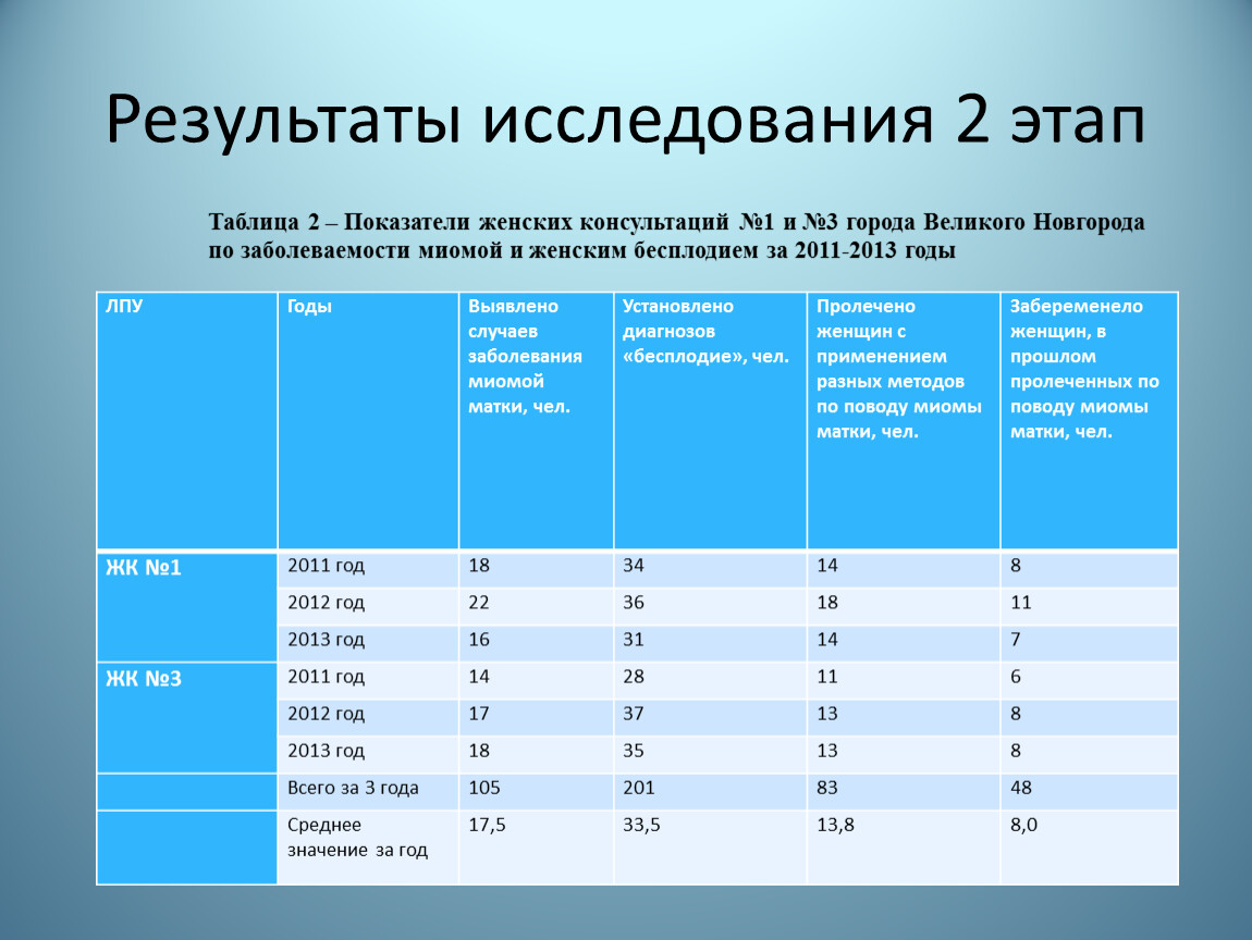 2 этап: Анализ медицинской документации и отчетных данных по женским консультациям №1 и №3 города Великого Новгорода с целью установления связи между наличием миомы матки и возникновением бесплодия у женщин.