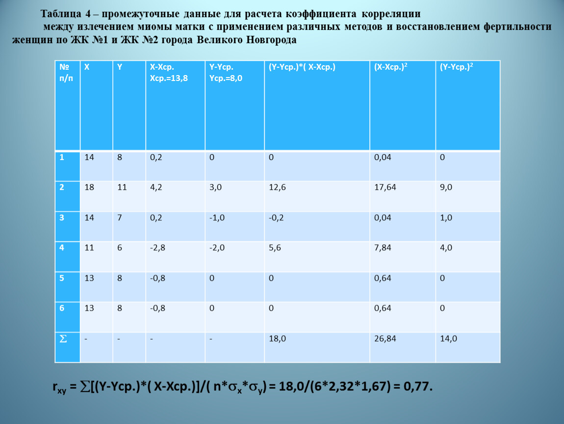 rхy = [(Y-Yср.)*( Х-Хср.)]/( n*х*y) = 18,0/(6*2,32*1,67) = 0,77.