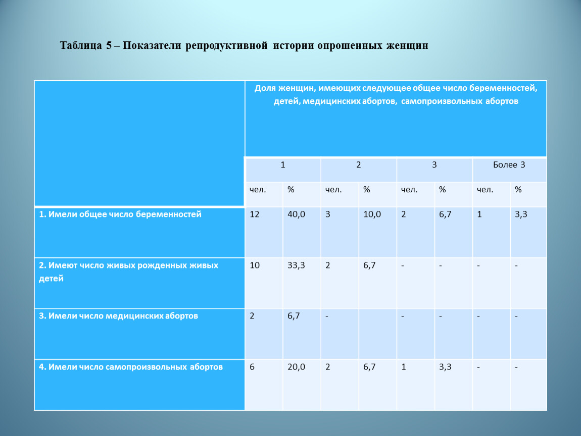 Таблица 5 – Показатели репродуктивной истории опрошенных женщин