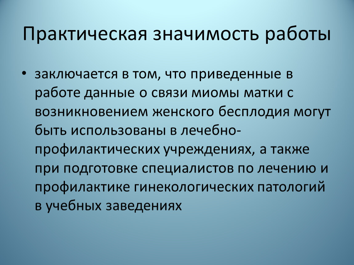 заключается в том, что приведенные в работе данные о связи миомы матки с возникновением женского бесплодия могут быть использованы в лечебно-профилактических учреждениях, а также при подготовке специалистов по лечению и профилактике гинекологических патологий в учебных заведениях