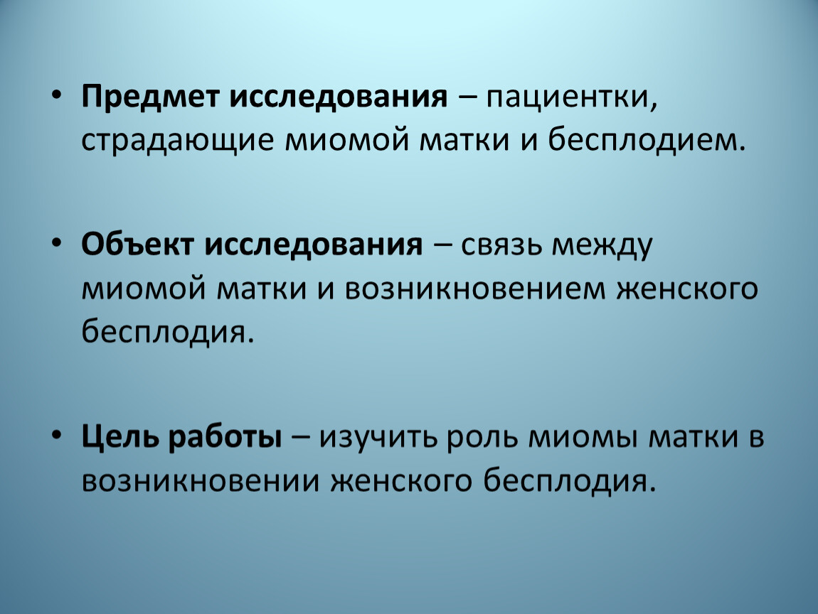 Объект исследования – связь между миомой матки и возникновением женского бесплодия.