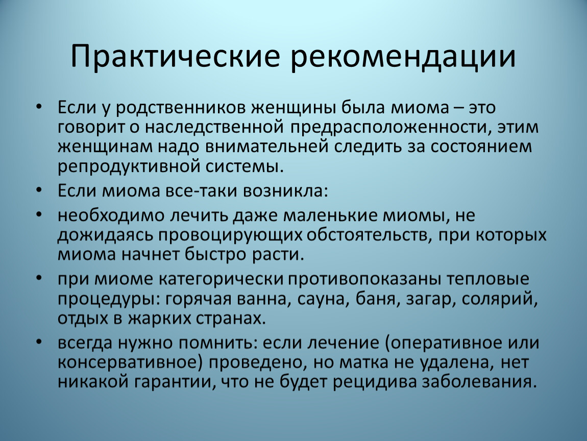 Если у родственников женщины была миома – это говорит о наследственной предрасположенности, этим женщинам надо внимательней следить за состоянием репродуктивной системы.