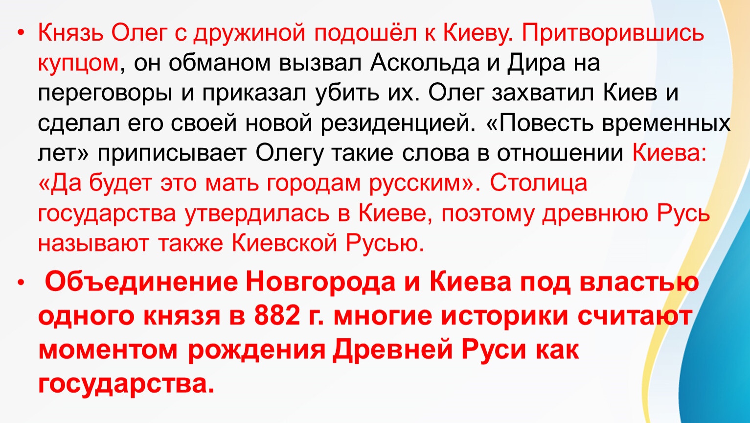 Объединение Новгорода и Киева под властью одного князя в 882 г. многие историки считают моментом рождения Древней Руси как государства.