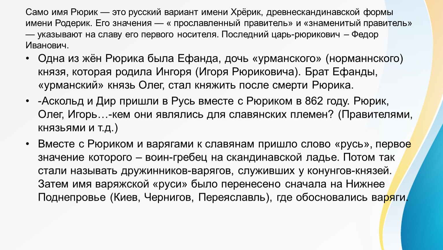 Вместе с Рюриком и варягами к славянам пришло слово «русь», первое значение которого – воин-гребец на скандинавской ладье. Потом так стали называть дружинников-варягов, служивших у конунгов-князей. Затем имя варяжской «руси» было перенесено сначала на Нижнее Поднепровье (Киев, Чернигов, Переяславль), где обосновались варяги.
