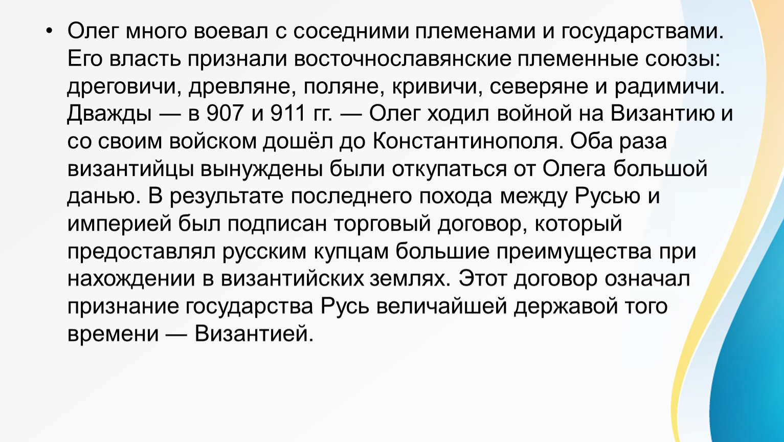 Олег много воевал с соседними племенами и государствами. Его власть признали восточнославянские племенные союзы: дреговичи, древляне, поляне, кривичи, северяне и радимичи. Дважды ― в 907 и 911 гг. ― Олег ходил войной на Византию и со своим войском дошёл до Константинополя. Оба раза византийцы вынуждены были откупаться от Олега большой данью. В результате последнего похода между Русью и империей был подписан торговый договор, который предоставлял русским купцам большие преимущества при нахождении в византийских землях. Этот договор означал признание государства Русь величайшей державой того времени ― Византией.