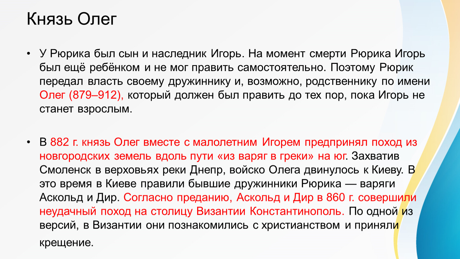 В 882 г. князь Олег вместе с малолетним Игорем предпринял поход из новгородских земель вдоль пути «из варяг в греки» на юг. Захватив Смоленск в верховьях реки Днепр, войско Олега двинулось к Киеву. В это время в Киеве правили бывшие дружинники Рюрика — варяги Аскольд и Дир. Согласно преданию, Аскольд и Дир в 860 г. совершили неудачный поход на столицу Византии Константинополь. По одной из версий, в Византии они познакомились с христианством и приняли крещение.