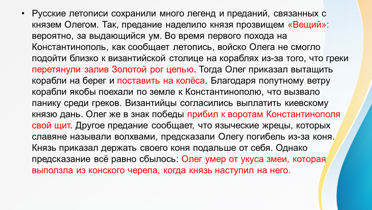 Русские летописи сохранили много легенд и преданий, связанных с князем Олегом. Так, предание наделило князя прозвищем «Вещий»: вероятно, за выдающийся ум. Во время первого похода на Константинополь, как сообщает летопись, войско Олега не смогло подойти близко к византийской столице на кораблях из-за того, что греки перетянули залив Золотой рог цепью. Тогда Олег приказал вытащить корабли на берег и поставить на колёса. Благодаря попутному ветру корабли якобы поехали по земле к Константинополю, что вызвало панику среди греков. Византийцы согласились выплатить киевскому князю дань. Олег же в знак победы прибил к воротам Константинополя свой щит. Другое предание сообщает, что языческие жрецы, которых славяне называли волхвами, предсказали Олегу погибель из-за коня. Князь приказал держать своего коня подальше от себя. Однако предсказание всё равно сбылось: Олег умер от укуса змеи, которая выползла из конского черепа, когда князь наступил на него.