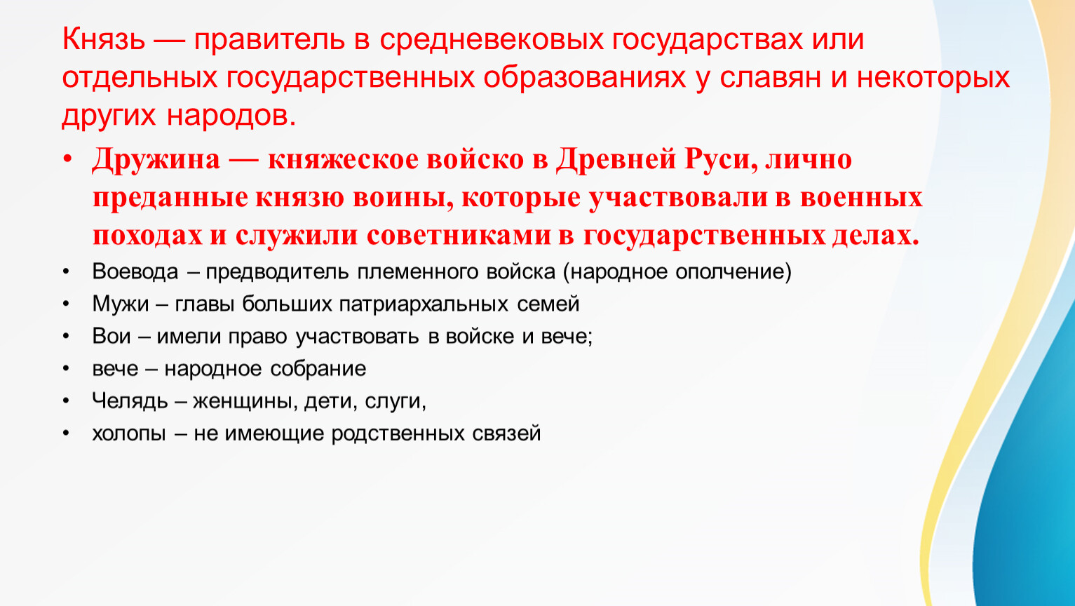Дружина ― княжеское войско в Древней Руси, лично преданные князю воины, которые участвовали в военных походах и служили советниками в государственных делах.